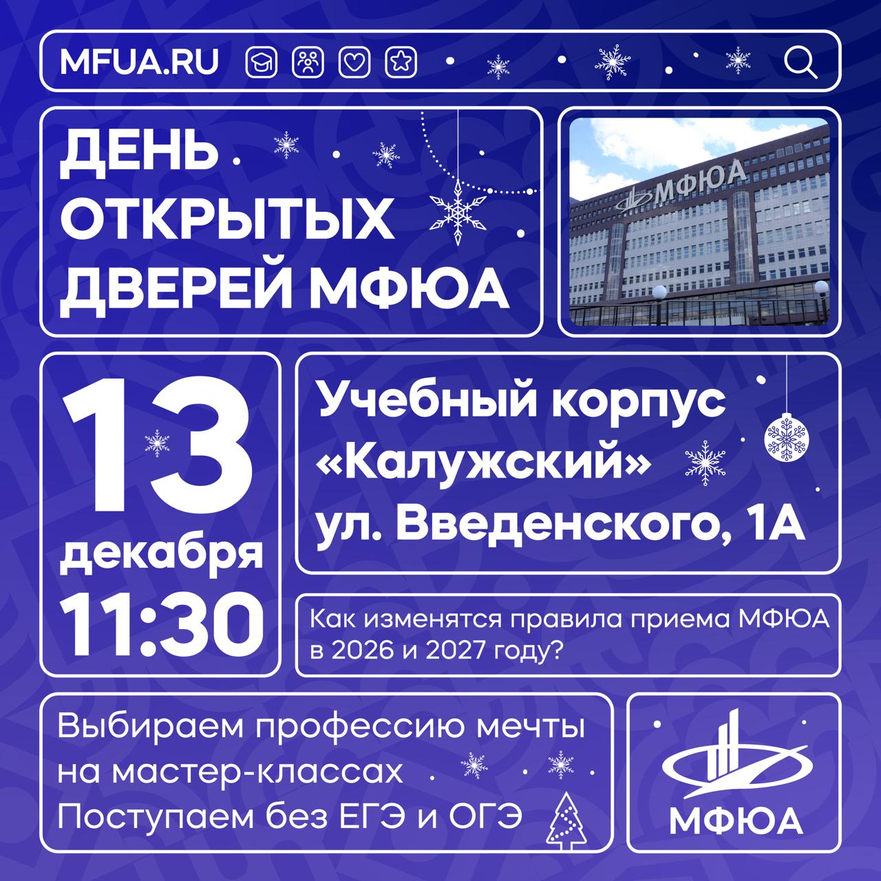 МФЮА приглашает абитуриентов и их родителей на праздник — новогодний День открытых дверей, который пройдёт 13 декабря в 11:30 в учебном корпусе «Калужский»!