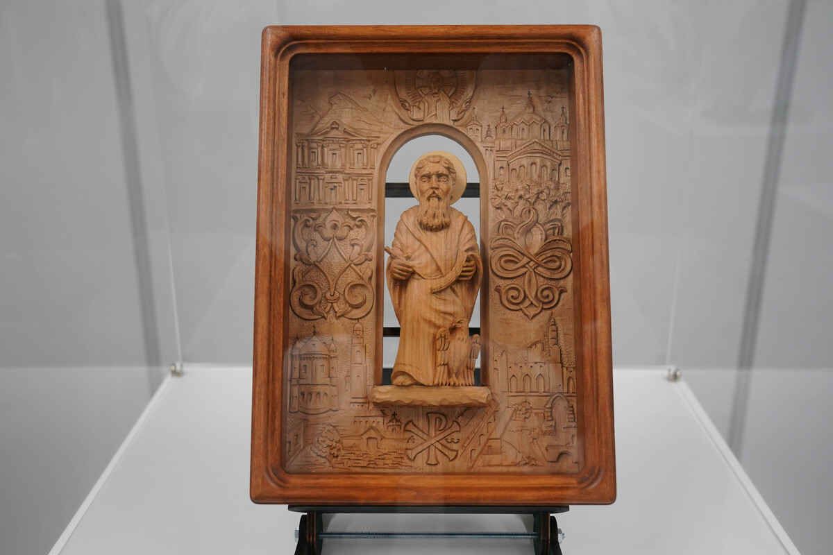 В этом нравственном отношении у наставников нашего времени есть общие мотивы с древними апостолами, учениками Иисуса Христа, учителями и проповедниками, которые неустанно трудились для распространения нового учения о спасении людей в Боге. На выставке, созданной благодаря частной коллекции Дома Абрамовых, представлено художественное осмысление этой глубокой темы – две композиции резных православных икон, объединенных одним названием «Апостолотека».