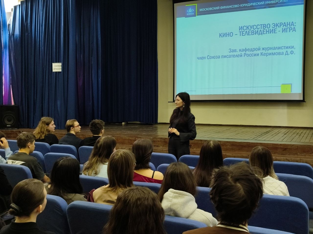 Заведующая кафедрой журналистики МФЮА, член Союза писателей России Динара Керимова провела мастер-класс «Искусство экрана: кино – телевидение – игра» в московской школе 1161. В мероприятии приняли участие ребята из 10 классов и их учителя.