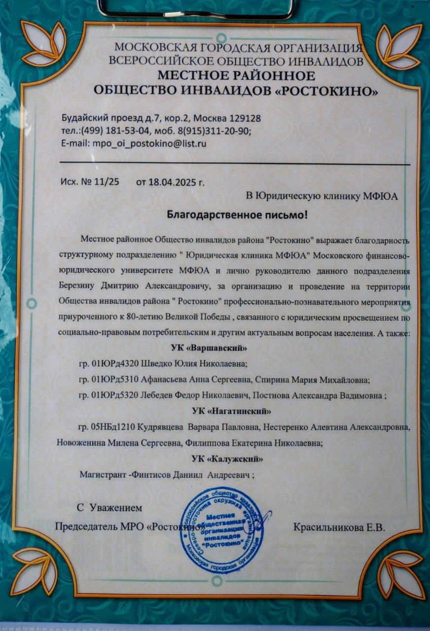 В апреле 2025 студенты юридической клиники МФЮА под руководством старшего преподавателя кафедры гражданско-правовых дисциплин Дмитрия Александровича Березина по запросу Общества инвалидов «Ростокино» провели профессионально-познавательный мастер-класс, в котором просветили слушателей по социально-правовым, потребительским и другим актуальным юридическим вопросам. После мастер-класса участники смогли обратиться к студентам за юридической консультацией по личным вопросам.