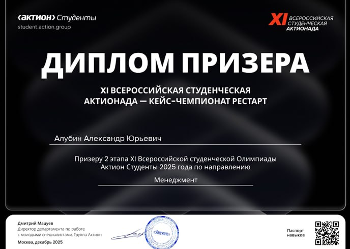 Студент Колледжа финансов и банковского дела МФЮА Александр Алубин стал призером второго этапа XI Всероссийской студенческой олимпиады «Актионада» – кейс-чемпионата «РЕСТАРТ» по направлению «Менеджмент». Александр показал высокий уровень подготовки, аналитического мышления и практических управленческих навыков.