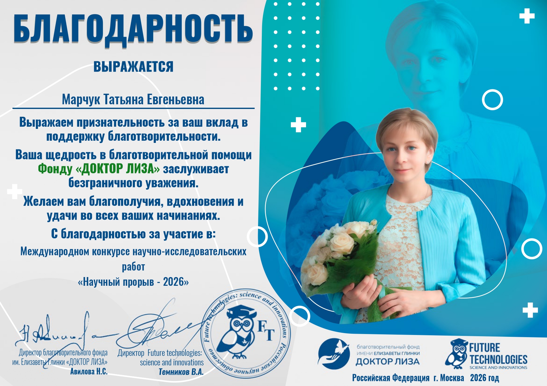 Кроме того, студентке объявлена благодарность от фонда «Доктор Лиза» за участие в мероприятии и поддержку благотворительности.