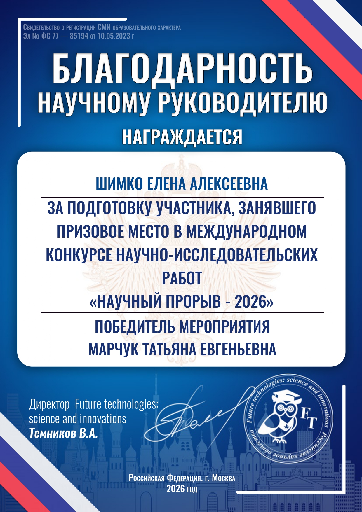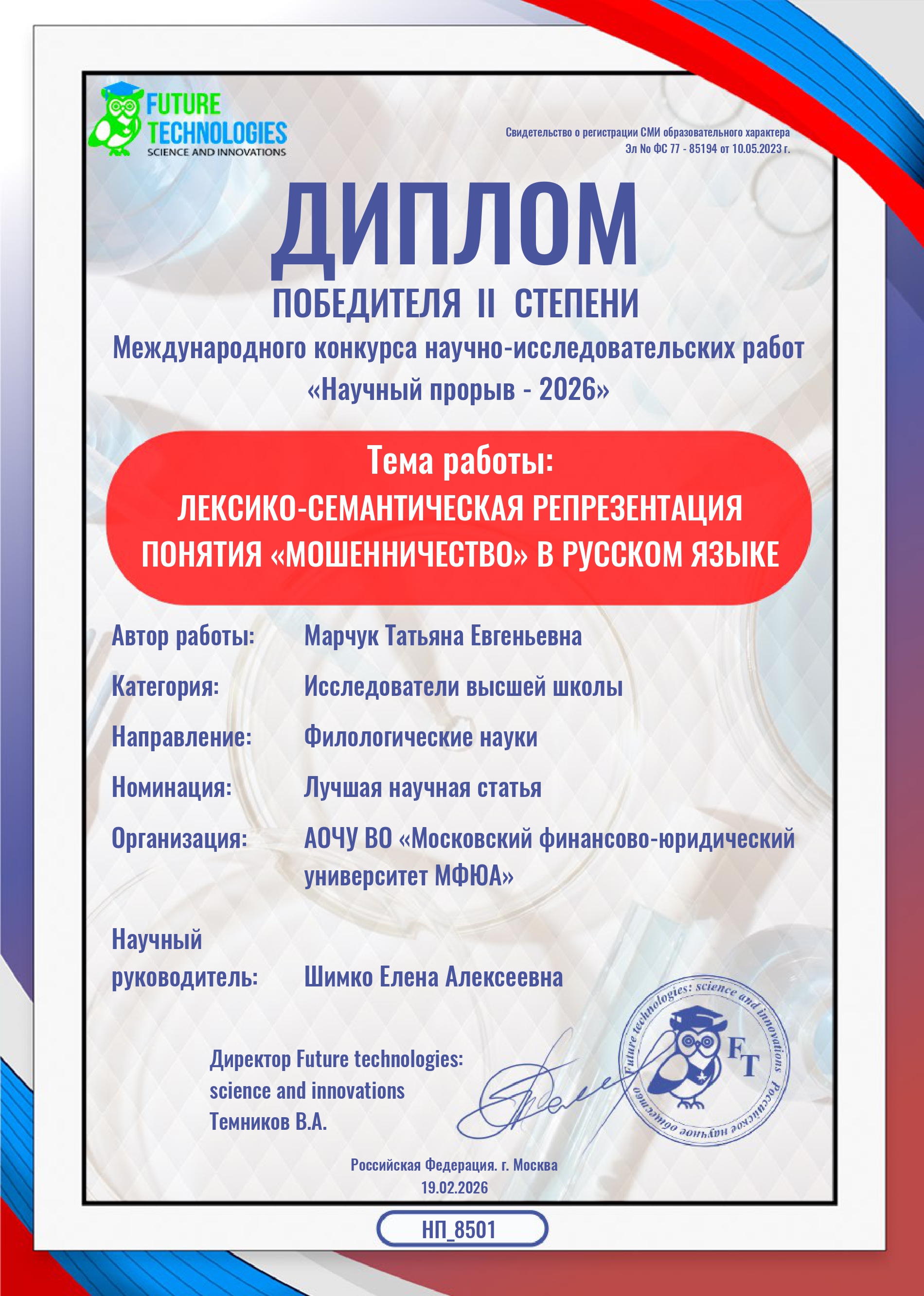 Студентка 3 курса кафедры журналистики МФЮА Татьяна Марчук вошла в число победителей Международного конкурса научно-исследовательских работ «Научный прорыв-2026». Ее работа «Лексико-сематическая репрезентация понятия «мошенничество» в русском языке», выполненная под руководством д.ф.н. Шимко Елены Алексеевны, была высоко оценена членами жюри, а сама студентка получила диплом победителя 2 степени.