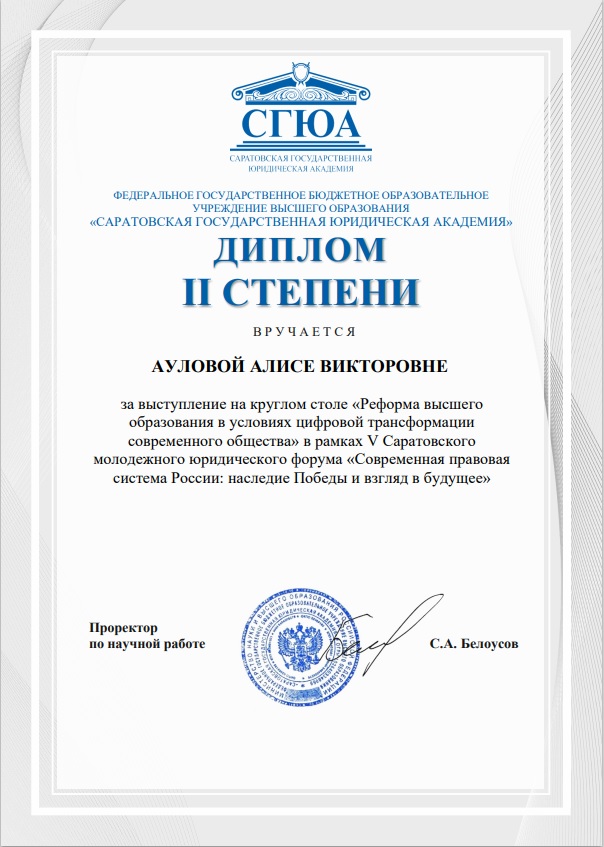 В рамках круглого стола, посвящённого реформе высшего образования в условиях цифровой трансформации, Алиса выступила с докладом «Век искусственного интеллекта: трансформация высшего образования» (научный руководитель — преподаватель кафедры гражданско-правовых дисциплин Моисеенко И. А.). В своём выступлении она обосновала необходимость обучения будущих юристов работе с системами искусственного интеллекта и необходимости изменений в законодательстве об образовании.