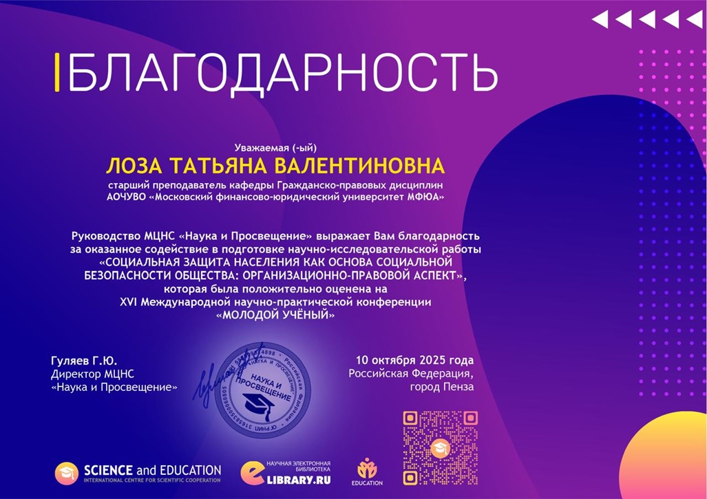 Под руководством старшего преподавателя Лозы Татьяны Валентиновны студентка подготовила научную работу на тему «Социальная защита населения как основа социальной безопасности общества: организационно-правовой аспект».
