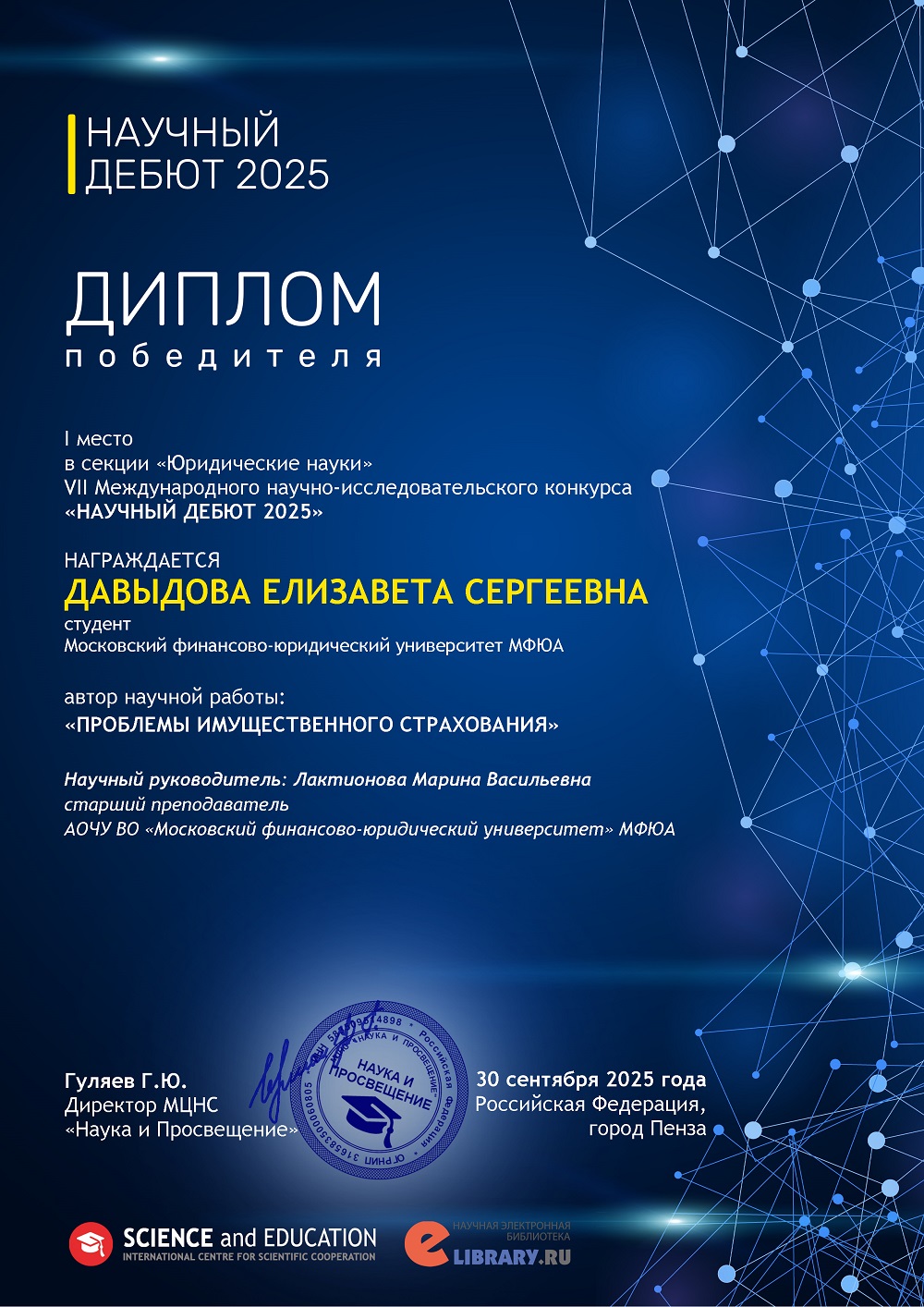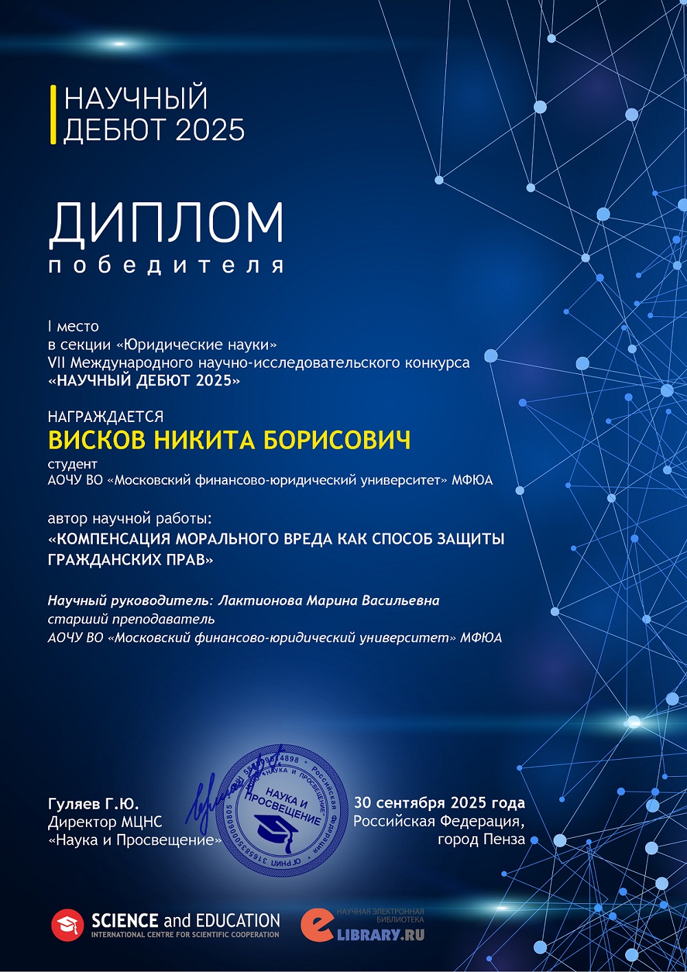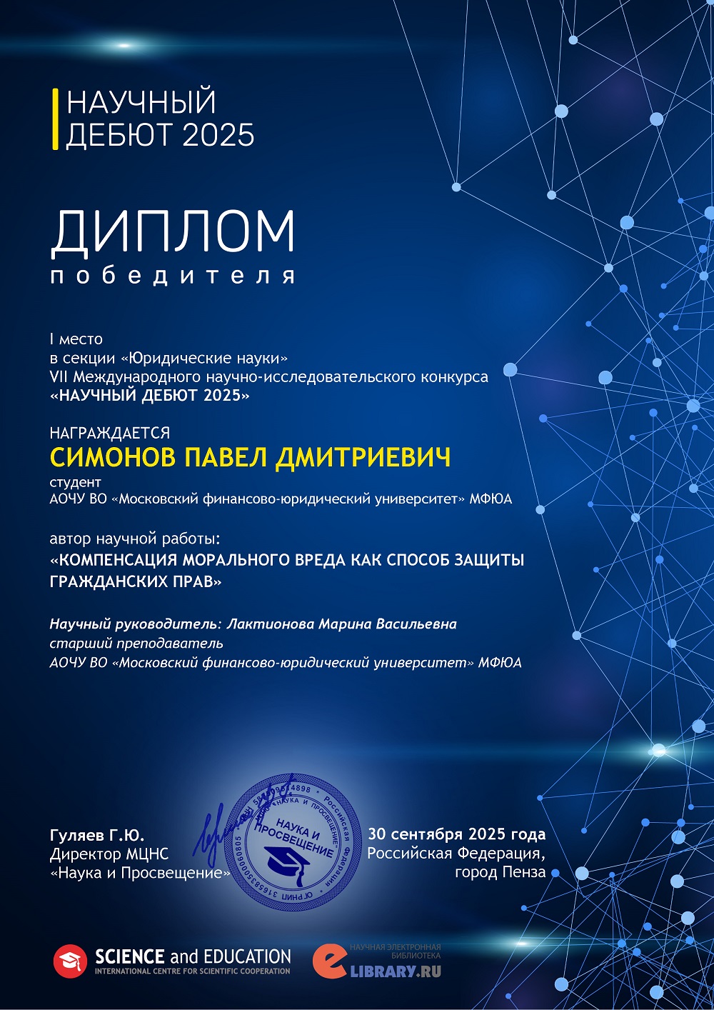 Студенты Московского финансово-юридического университета МФЮА блестяще выступили на VII Международном научно-исследовательском конкурсе «Научный дебют 2025», состоявшемся 30 сентября в г. Пенза. Под руководством старшего преподавателя кафедры гражданско-правовых дисциплин МФЮА Марины Васильевны Лактионовой студенты Павел Симонов, Никита Висков и Елизавета Давыдова заняли призовые места в секции «Юридические науки», подтвердив высокий уровень подготовки и актуальность своих исследований.