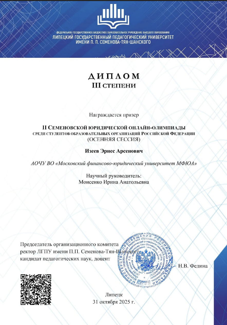 С 1 по 31 октября 2025 года проходила II Семёновская юридическая онлайн-олимпиада среди студентов образовательных организаций Российской Федерации. В мероприятии приняли участие студенты Московского финансово-юридического университета под руководством старшего преподавателя кафедры гражданско-правовых дисциплин Моисеенко Ирины Анатольевны.